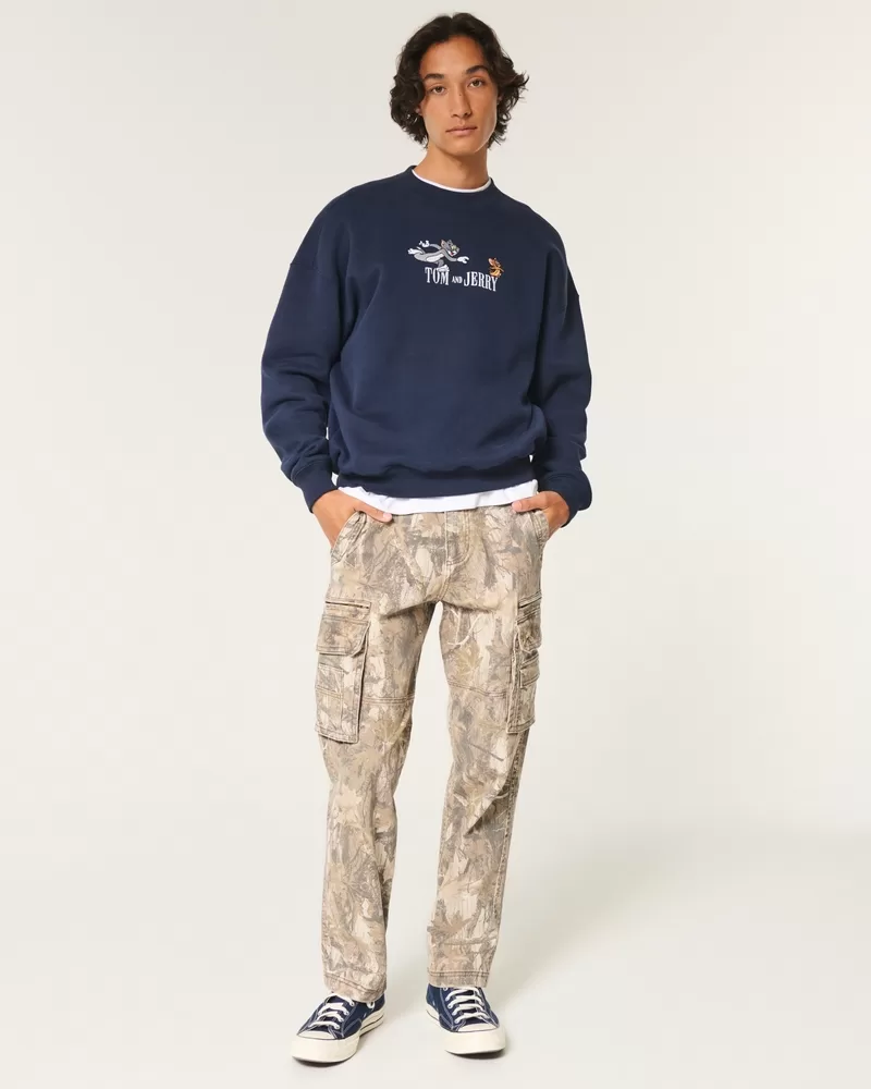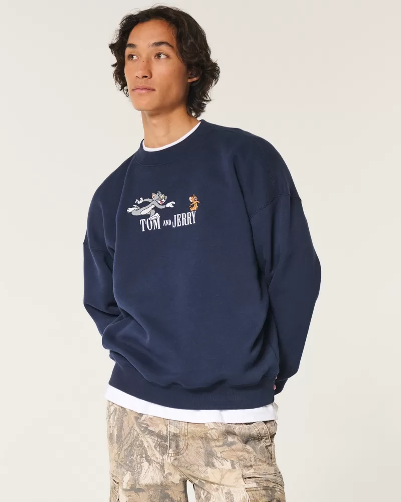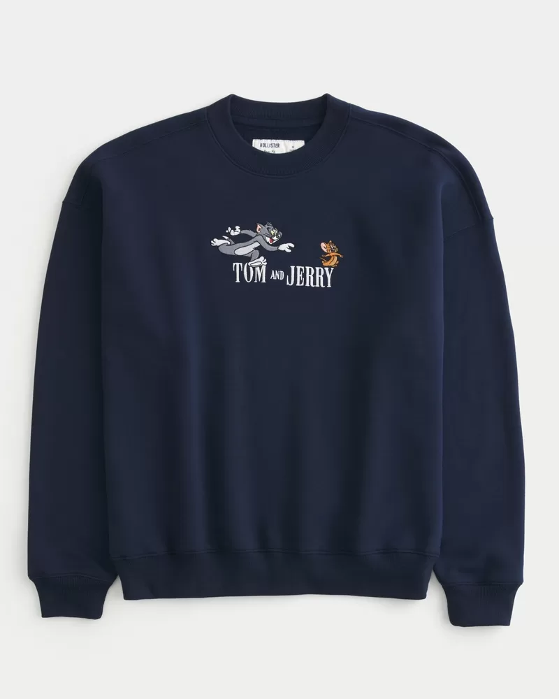 A super soft fleece sweatshirt featuring official licensed Tom and Jerry graphic embroidery. Crew neckline, long sleeves.