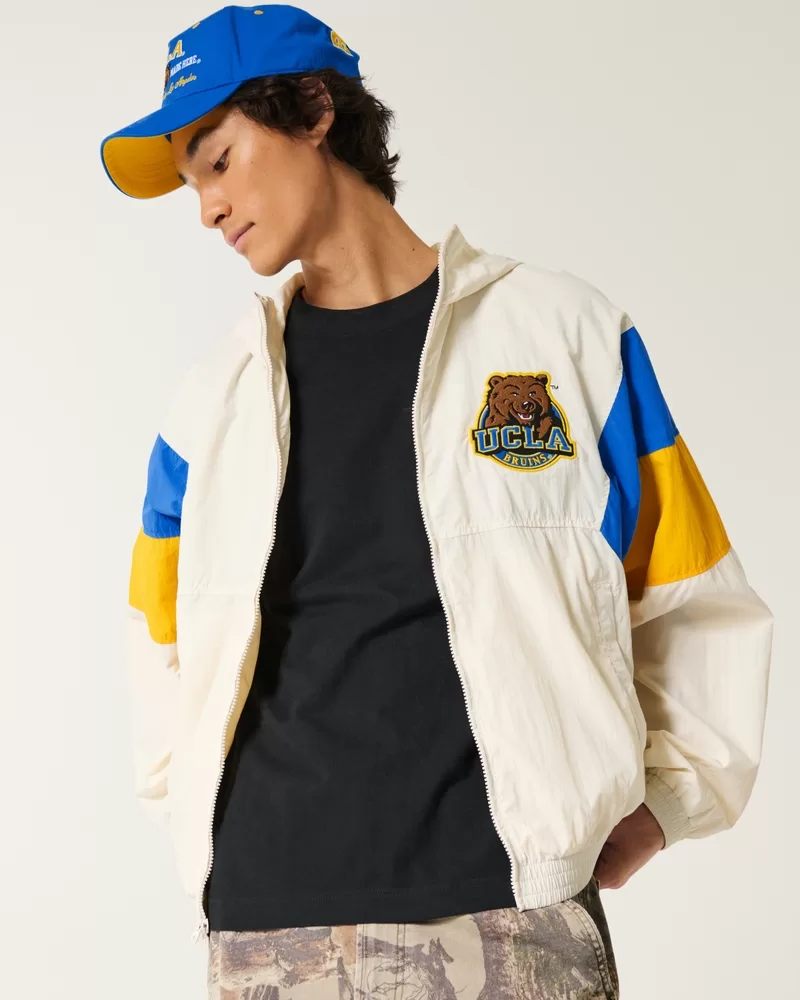 A classic windbreaker jacket with official licensed UCLA Bruins graphic applique at the left chest, right sleeve and back. Full zip-up closure, front pockets, hood.