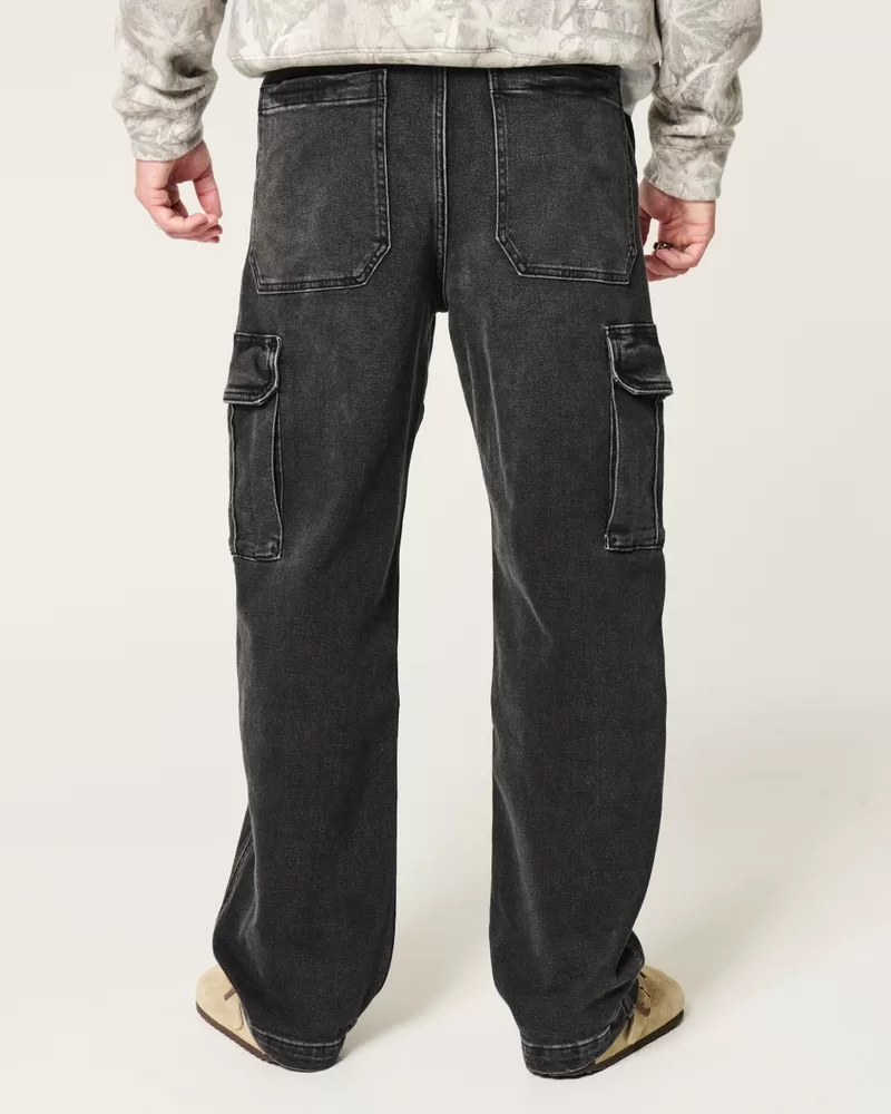 Ultra-comfortable denim jeans in washed black, designed with a baggy leg and side cargo pockets. Knee seams, fading and whiskering.