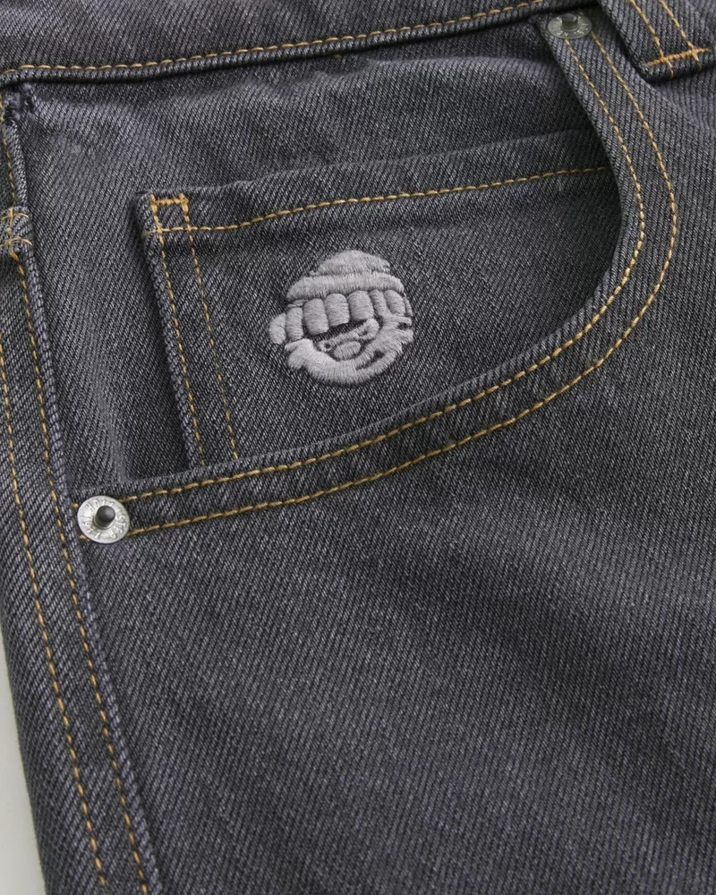 Comfortable denim skater jeans designed with a baggy leg. Washed black, embroidered graphic at right coin pocket.