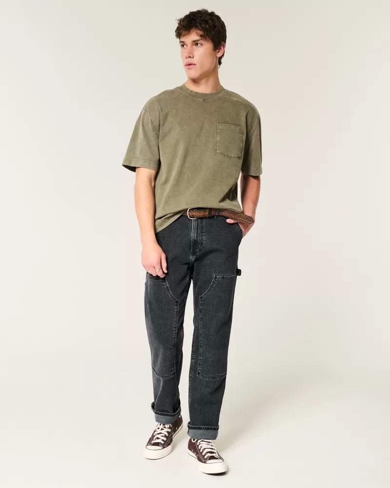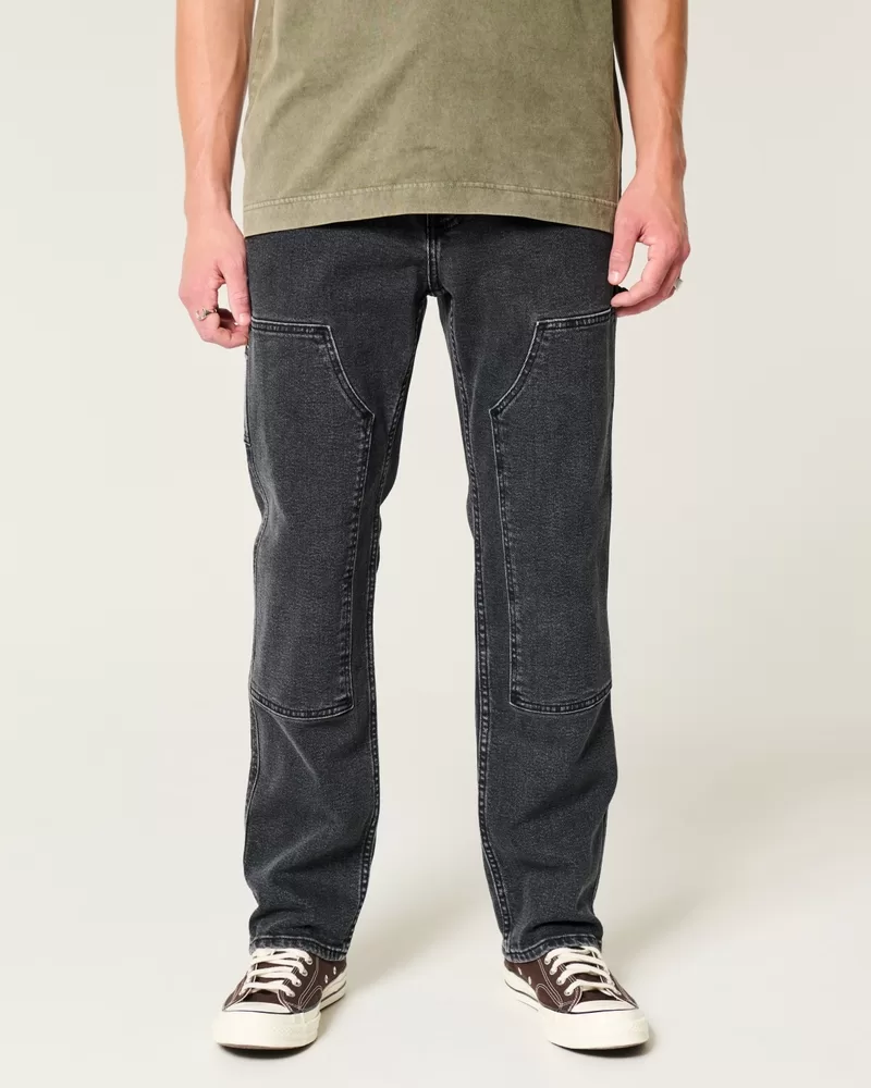 Classic carpenter-style denim jeans in washed black, designed with a loose leg and reinforced knee stitching. Left hammer loop, extra pockets. Imported.