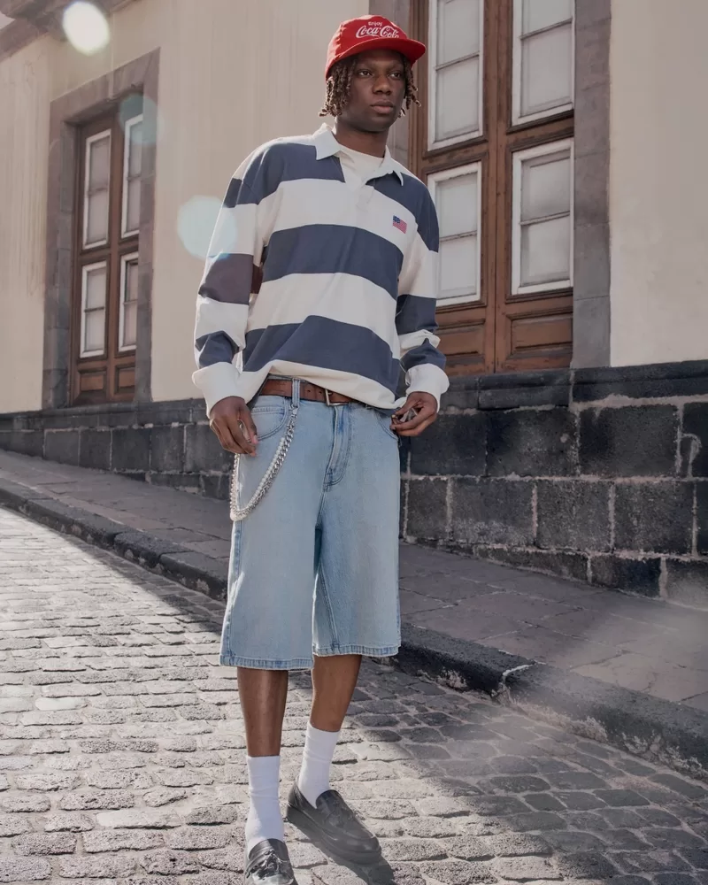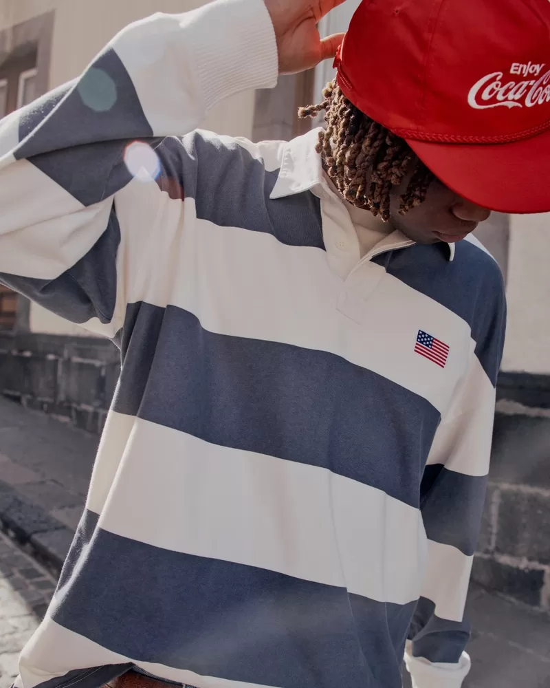 A long-sleeve rugby polo in heavyweight 100% cotton fabric with stripes and an embroidered left chest American Flag detail. Collar, button placket. Boxy Fit.