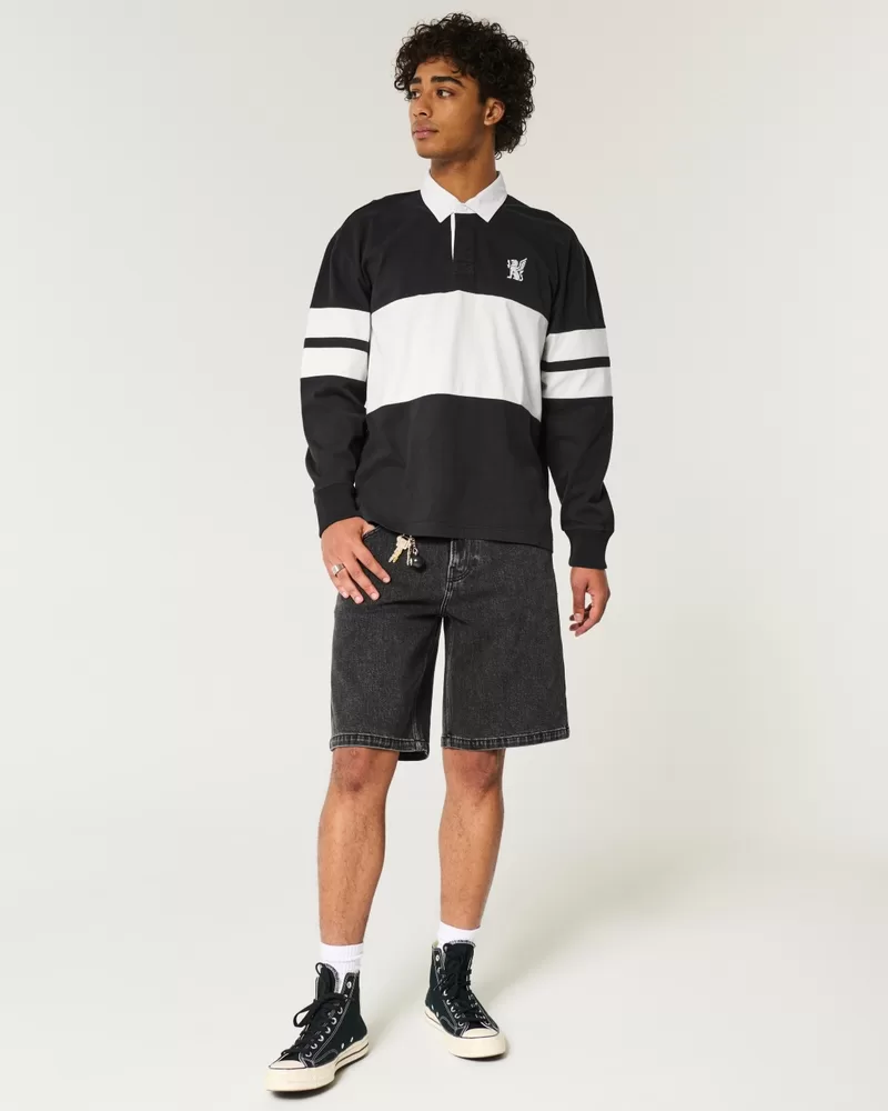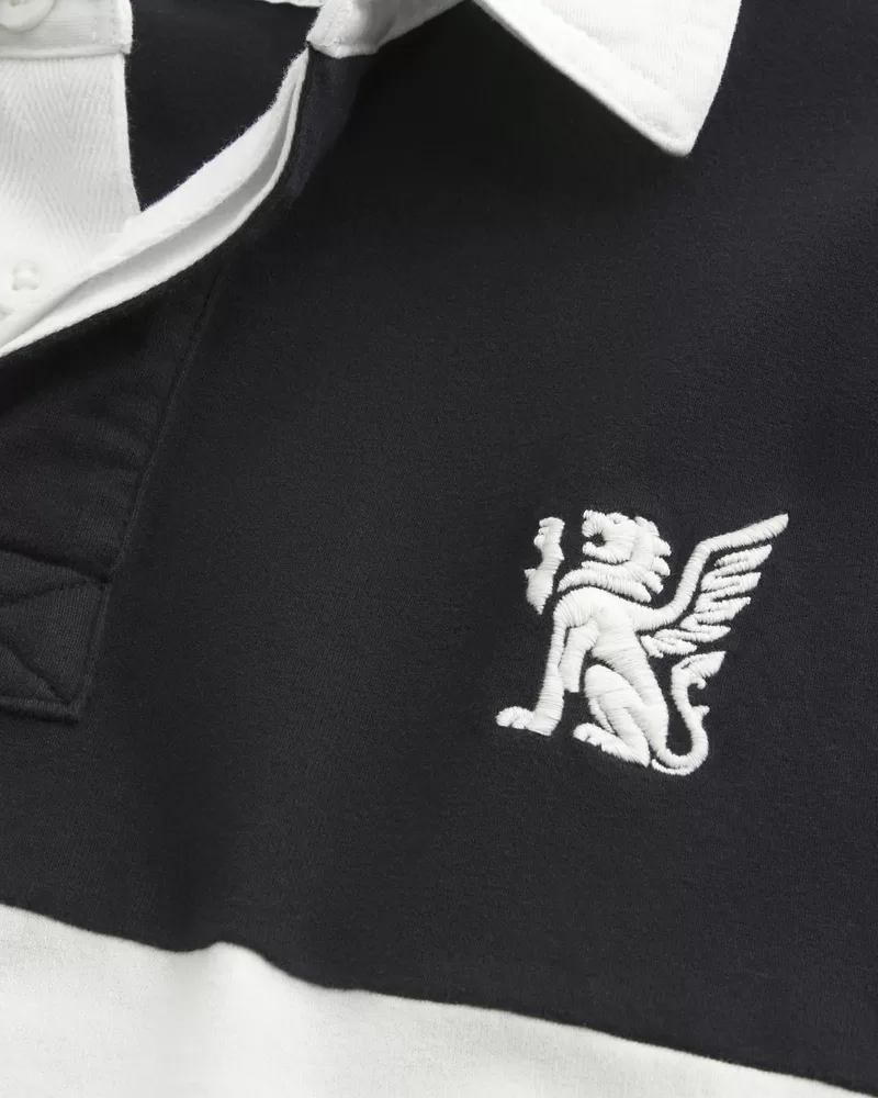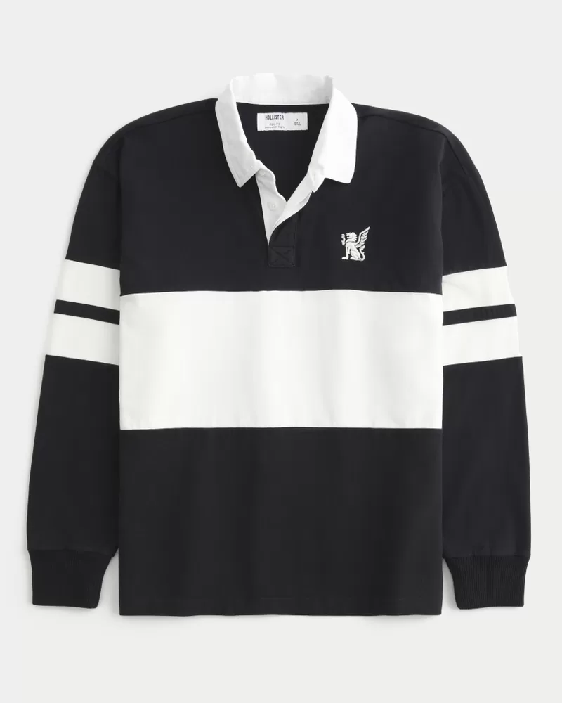 A long-sleeve rugby polo in heavyweight 100% cotton fabric with stripes and an embroidered left chest icon detail. Collar, button placket. Boxy Fit. Imported.