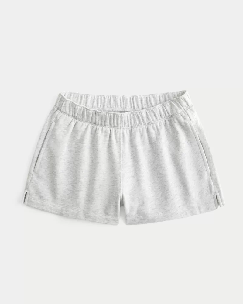 Super soft fleece shorts designed with a banded adjustable-rise waist. Pockets.