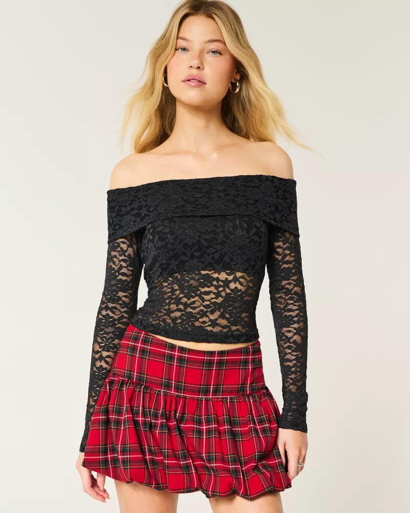 A pretty and super soft top in all-over lace with long sleeves and a foldover off-the-shoulder neckline. Interior lining at bust. Imported.