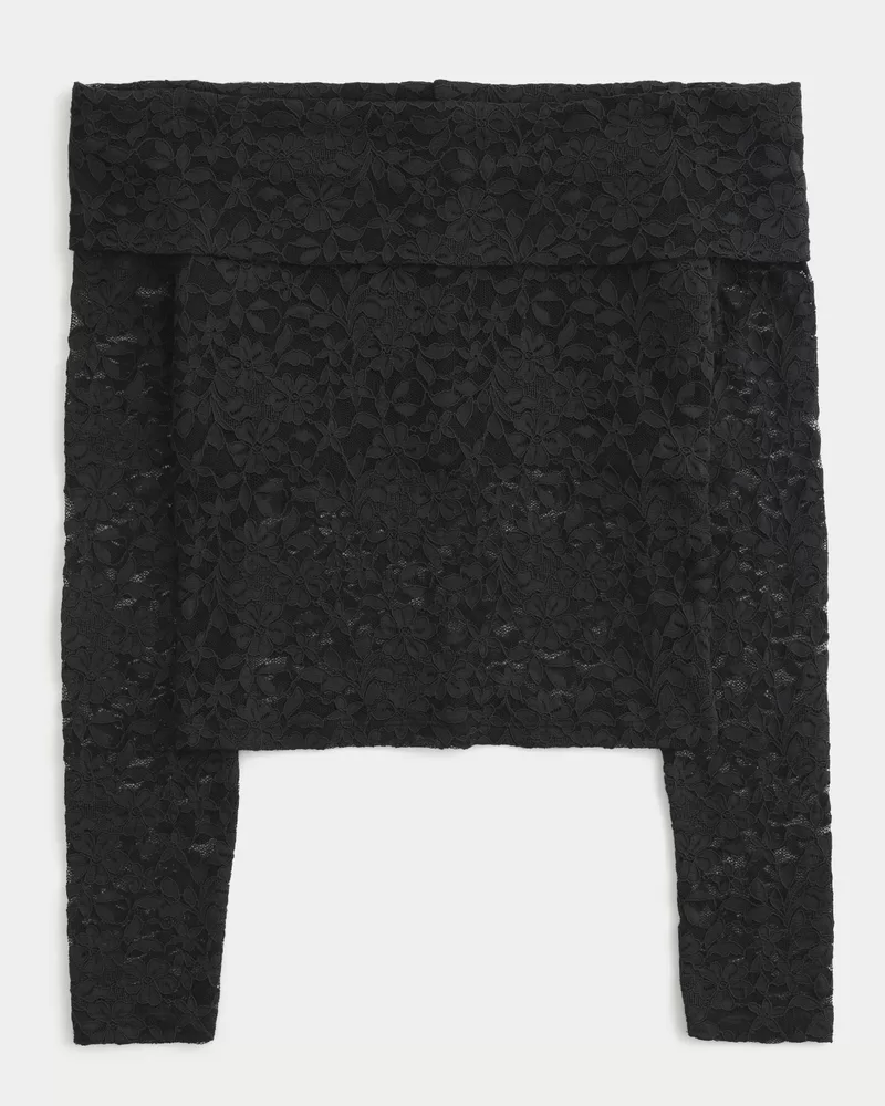 A pretty and super soft top in all-over lace with long sleeves and a foldover off-the-shoulder neckline. Interior lining at bust.