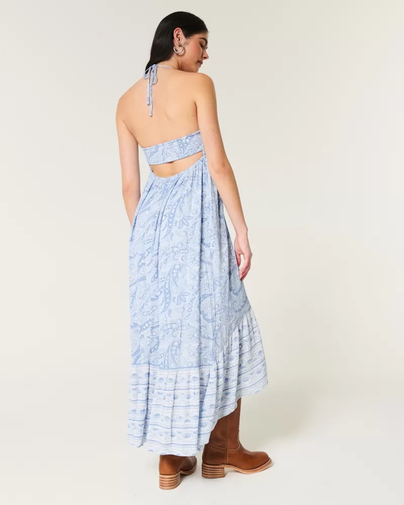 This super soft and flowy maxi-length dress has removable pads and pockets. Whimsical asymmetrical hem, adjustable halter straps, split hem detail.