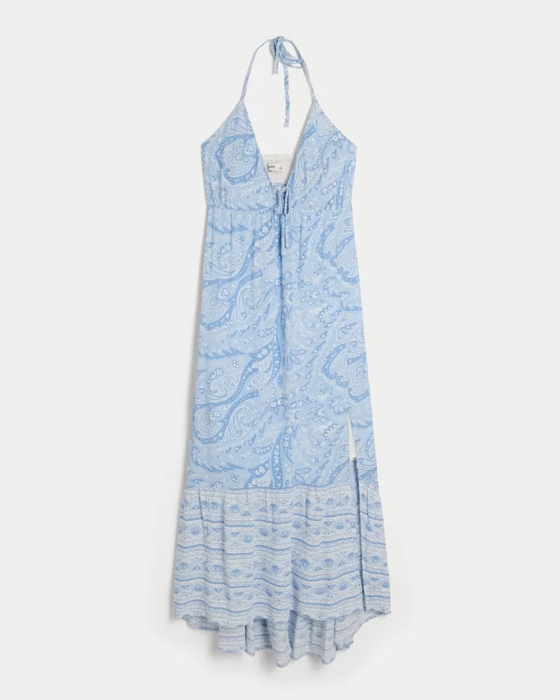 This super soft and flowy maxi-length dress has removable pads and pockets. Whimsical asymmetrical hem, adjustable halter straps, split hem detail. Imported.