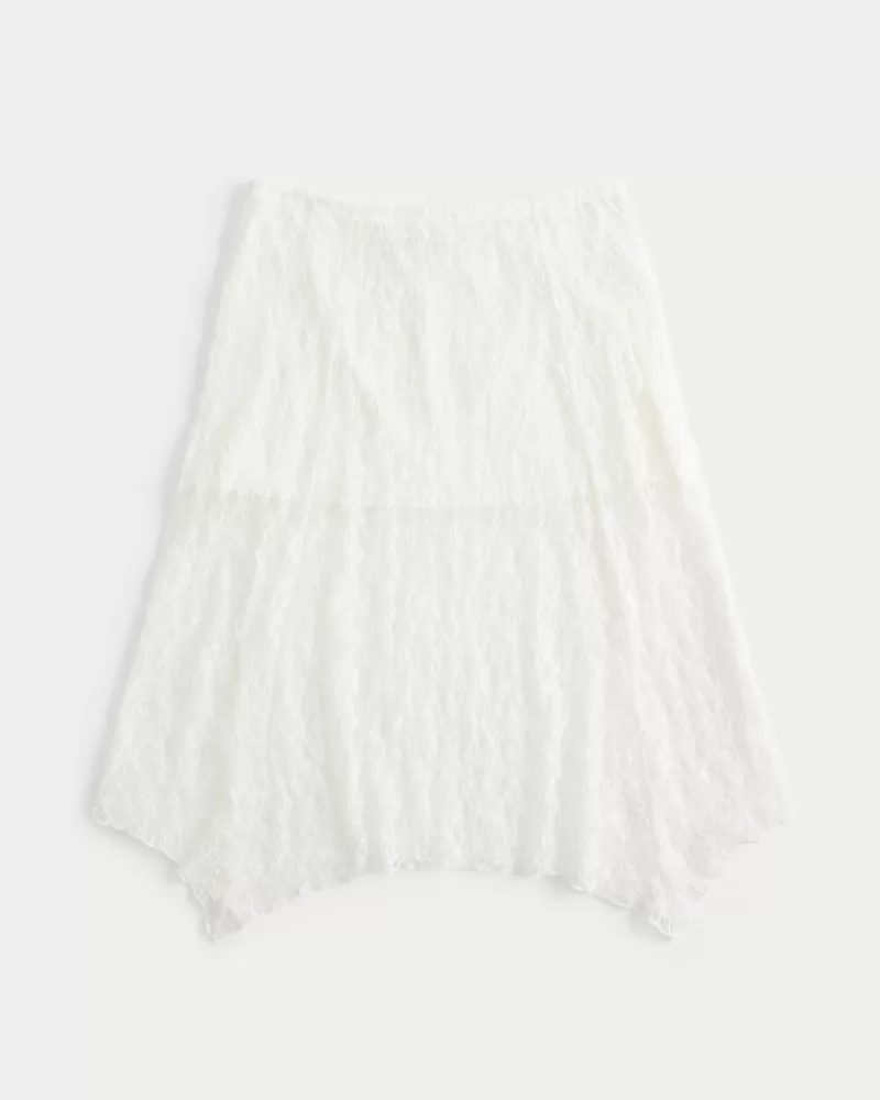 Flowy and super soft, this skirt is designed with a midi length and low-rise waist. Features pretty all-over lace fabric and an asymmetrical hem. Side seam zipper, mini-length lining.