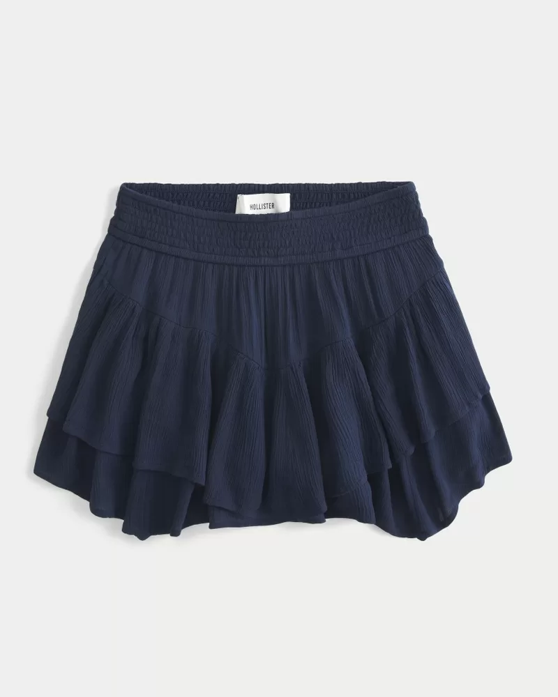 Flowy and super soft, this mini skort is designed with a mid-rise waist and features hidden shorts, pockets, a smocked waistband and asymmetrical hem.