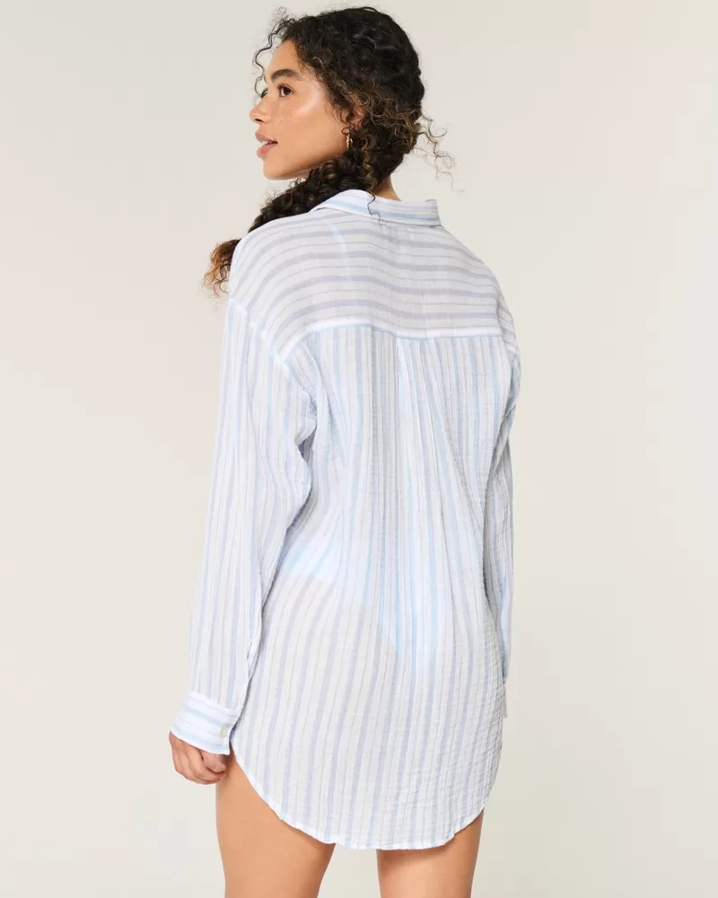 A pretty and super soft cover up shirt dress with a full button closure. Left chest pocket, collar, long sleeves, curved hem. Imported.