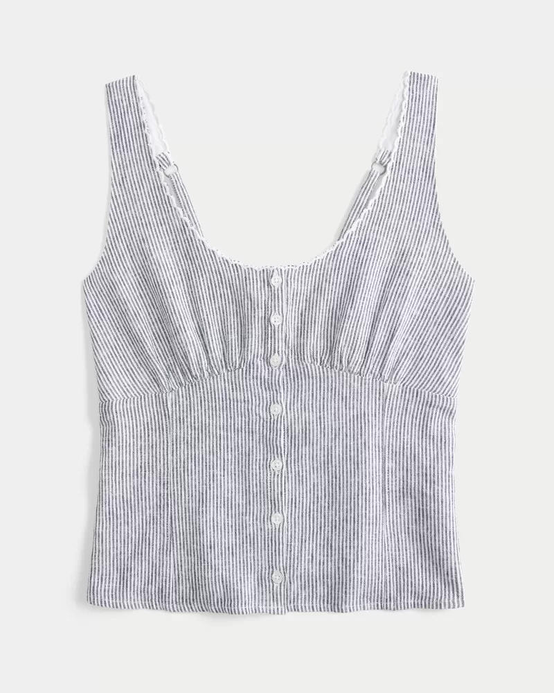 This pretty blouse features pretty embroidered detailing and scalloped trim along the straps, a scoop neckline and button-through closure. Soft smocked back. Slim Fit.
