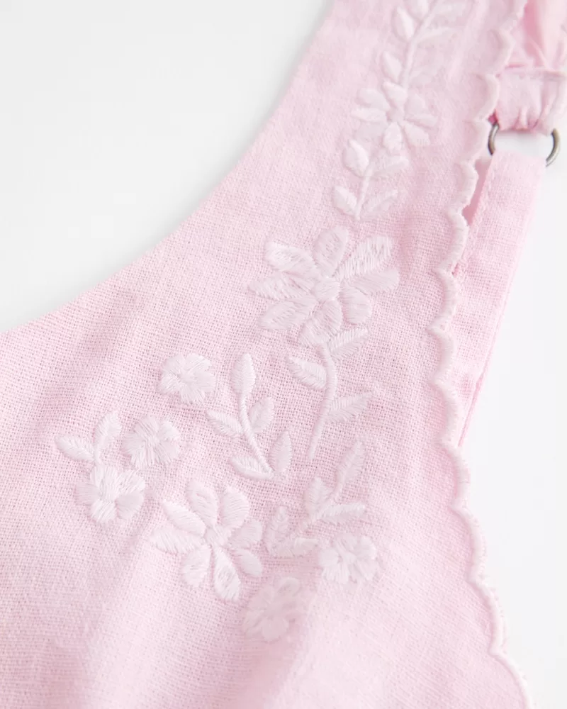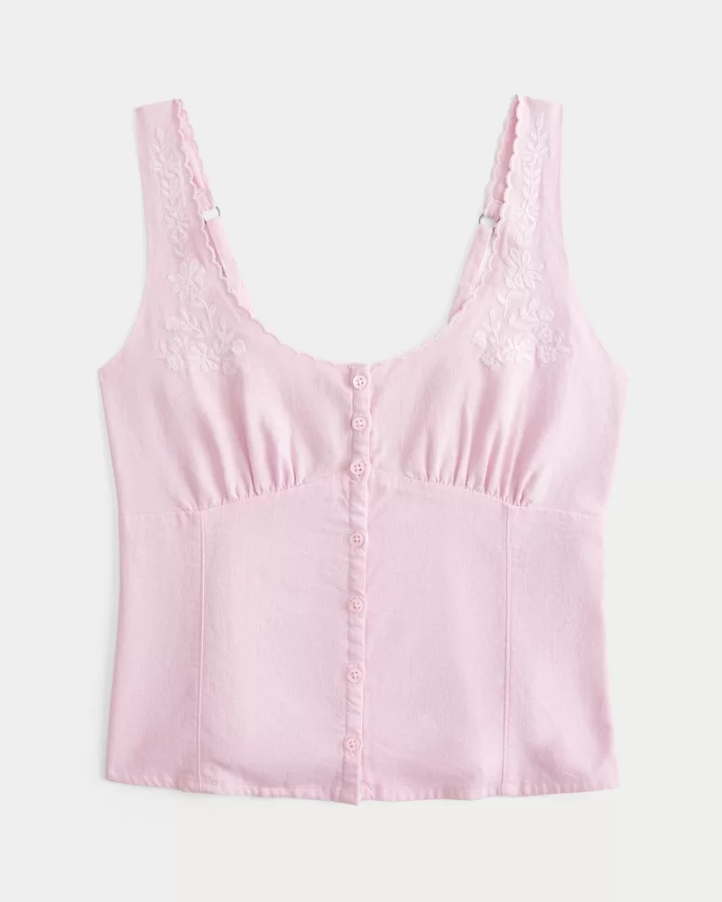 This pretty blouse features pretty embroidered detailing and scalloped trim along the straps, a scoop neckline and button-through closure. Soft smocked back. Slim Fit.