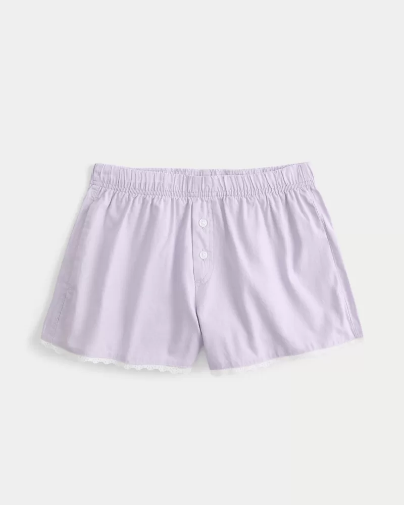 These cute and comfy boxer shorts are made with soft cotton fabric. Banded adjustable-rise waistband, pockets, buttons, scalloped lace trim. Imported.
