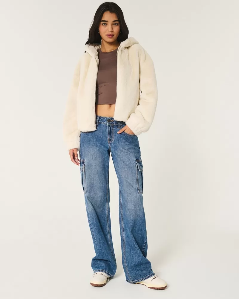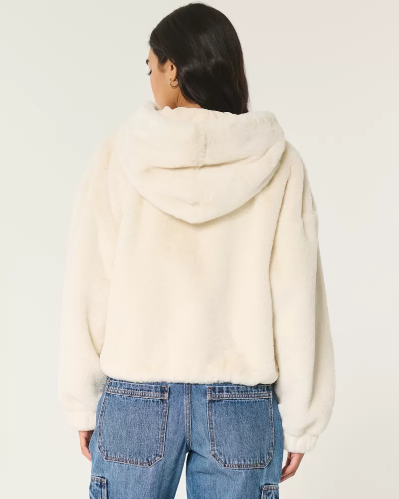 This cute hoodie is made with super soft faux fur fabric and features a full zip-up closure, interior pockets and front pockets. Banded cuffs, hood, fully lined.