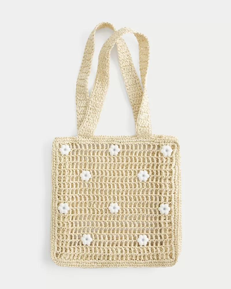 A cute beach bag in crochet-style paper fabric, featuring all-over floral details.
