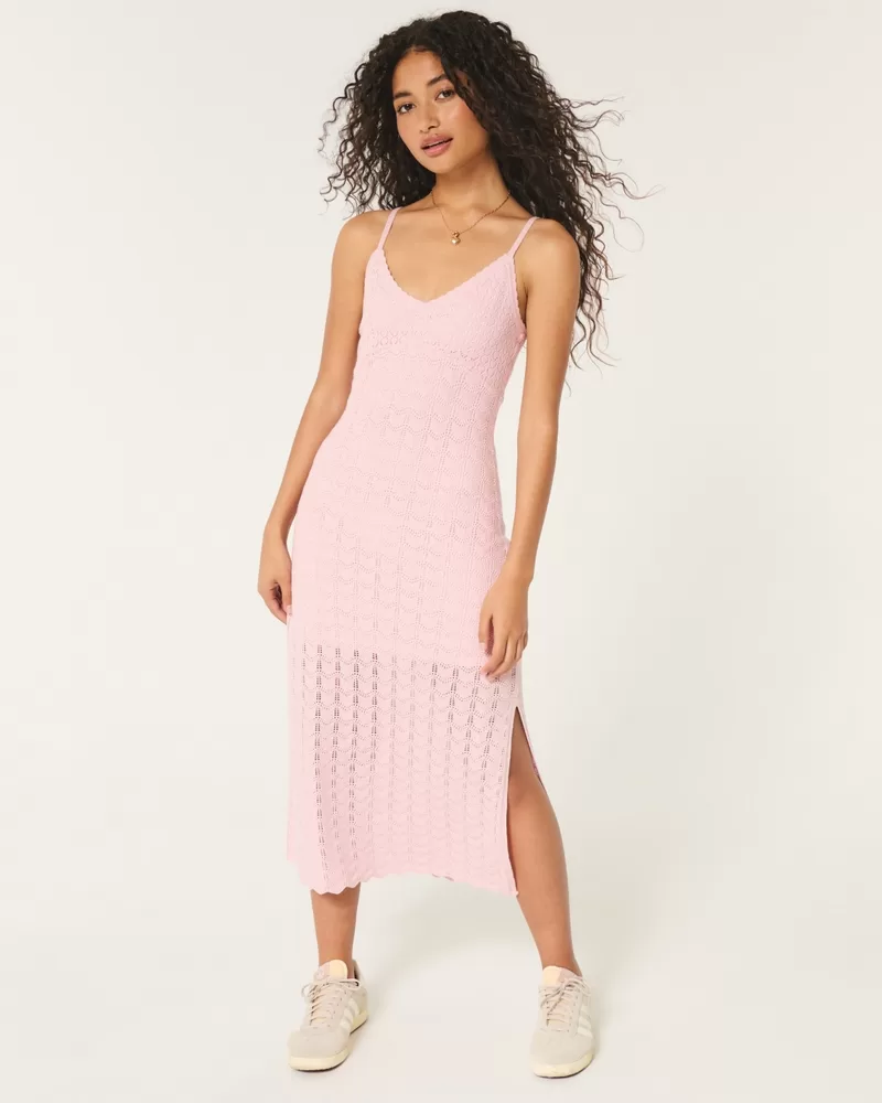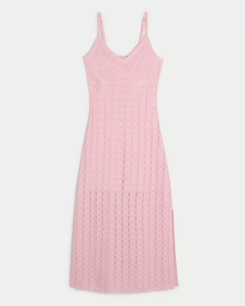 This pretty midi-length dress is made with super soft crochet-style fabric and features all-over stitched patterns. Split hem detail, adjustable straps.