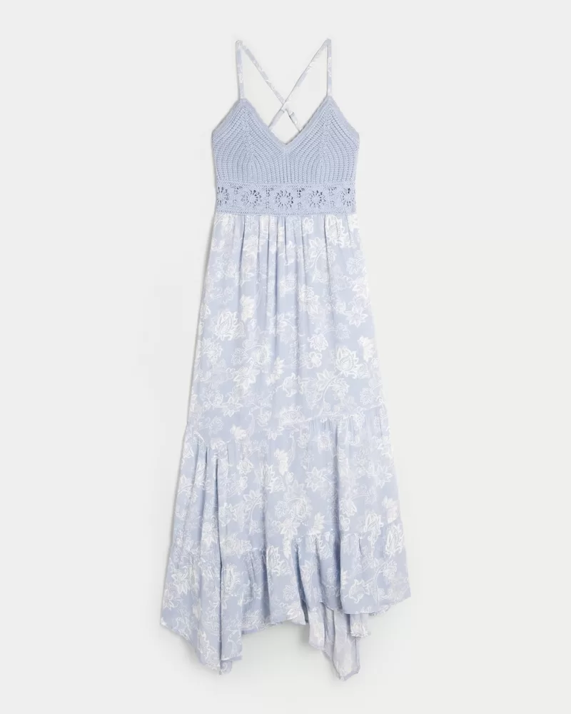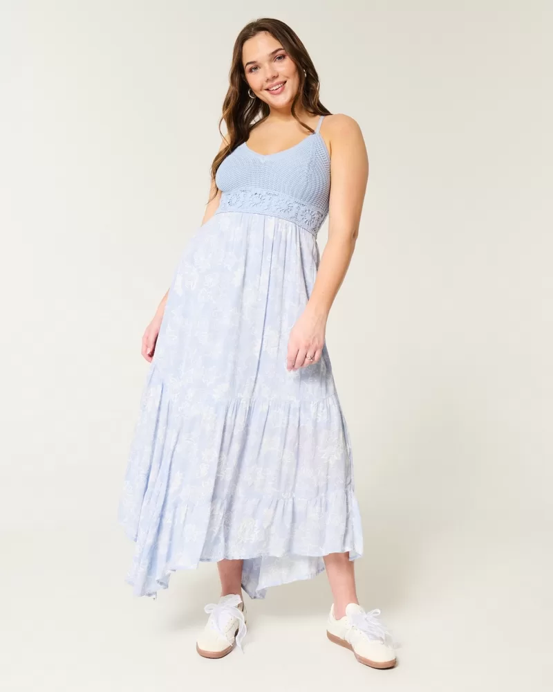This pretty maxi-length dress features fabric mixing with a super soft crochet-style bodice and flowy woven skirt. Cute stitched patterns, asymmetrical hem, v-neck, adjustable cross-back straps, pockets.