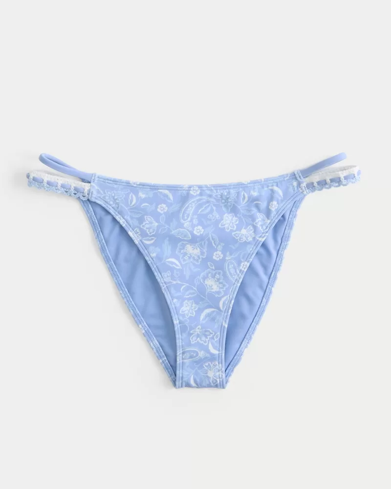 Your new fave bikini bottom is made with soft swim fabric and features double side straps with crochet-style details. Cheeky coverage, high-leg silhouette.