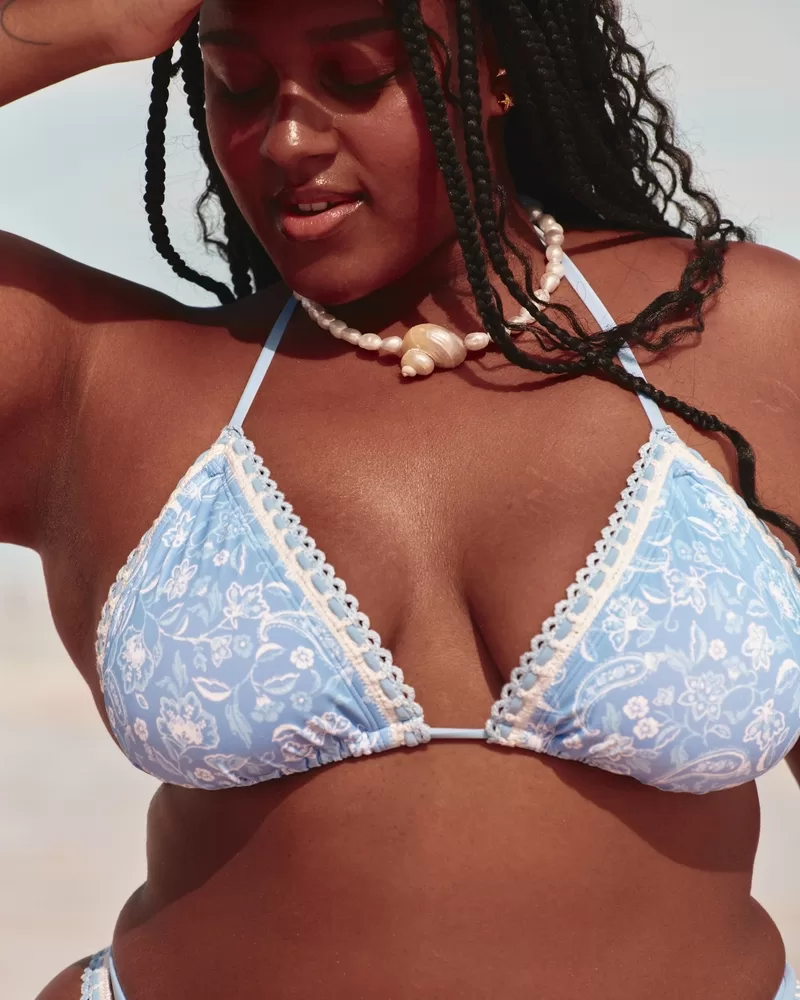 A super cute bikini top with a mix of soft swim fabric and crochet-style edge trim. Triangle silhouette with halter straps, removable pads, tie back straps.