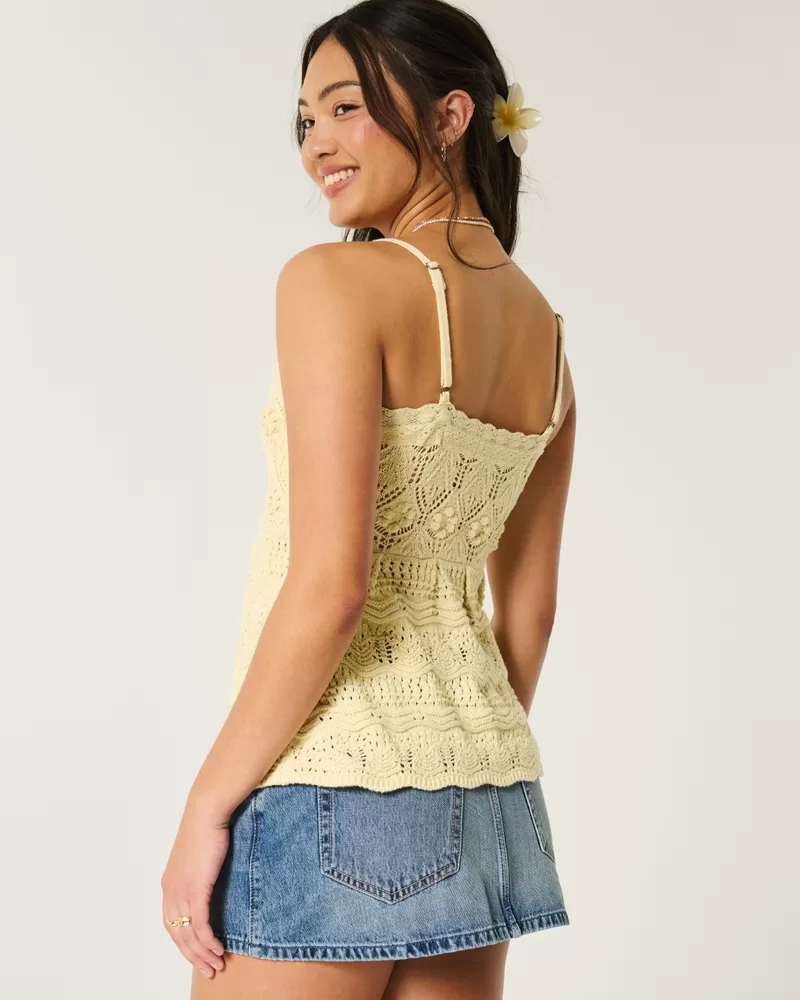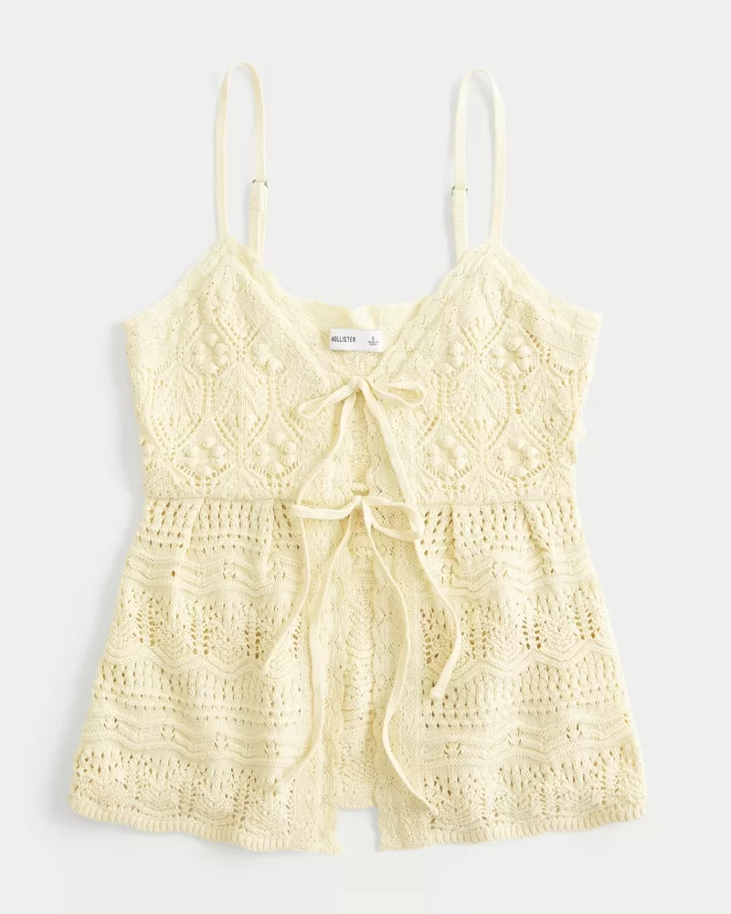 This super soft sweater tank features pretty crochet-style patterns and a tie-front closure. Adjustable straps, v-neckline. Slim Fit. Imported.