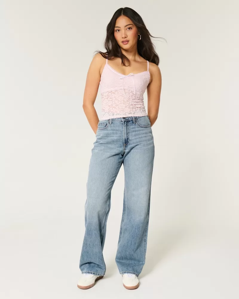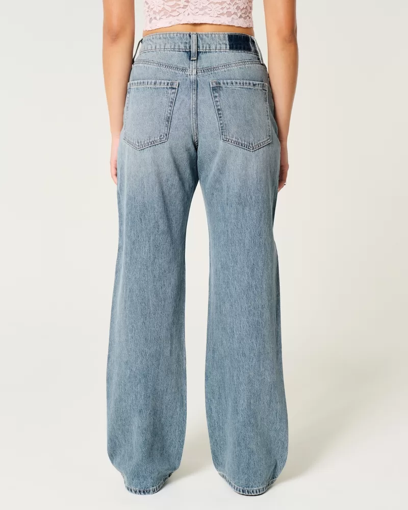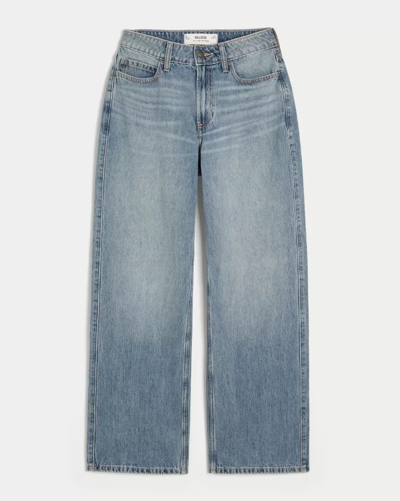 Flattering high-rise waist, medium wash denim with fading and whiskering. Baggy leg. Imported.