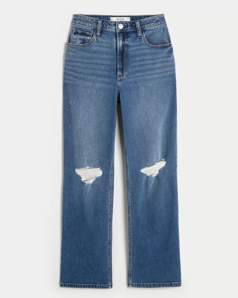 Designed with an ultra high-rise waist and relaxed leg. Vintage Stretch denim in a medium wash with fading, whiskering and ripped details. Imported.