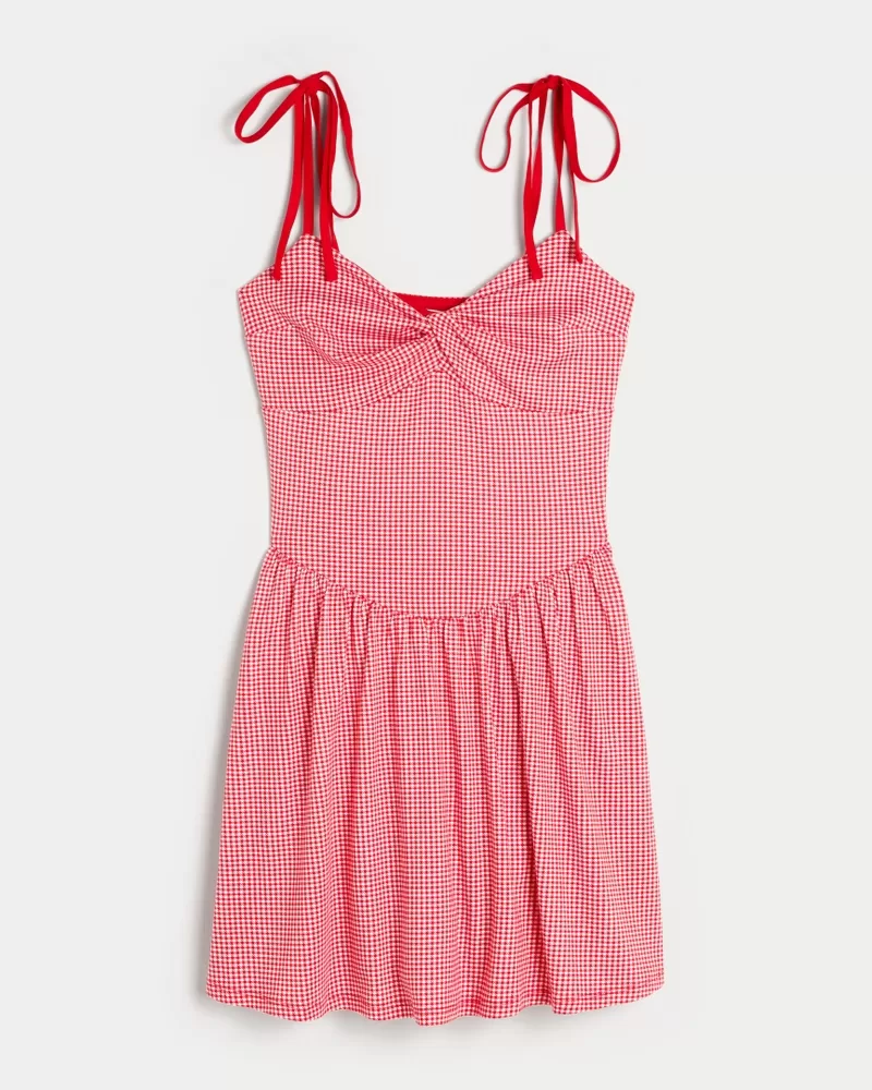 A cute and super soft knit mini dress with adjustable tie straps. V-drop waist, bathroom-friendly knit shorts with phone pocket.