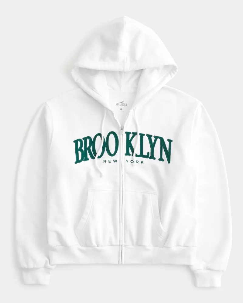 Comfy and super soft, this fleece hoodie features Brooklyn New York graphic applique and embroidery. Full zip-up closure, drawstring hood, front pockets, long sleeves. Easy Fit. Imported.