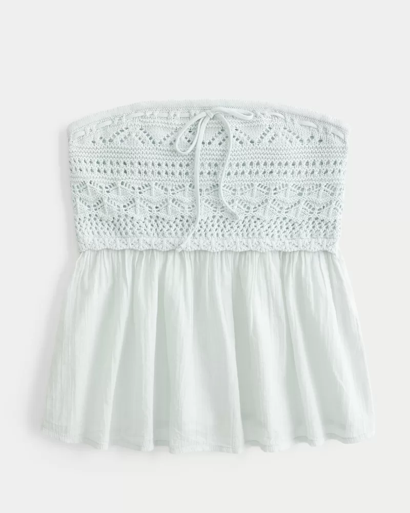 This strapless babydoll top features a crochet-style bust, crinkle voile skirt and smocked back for comfort. Passementerie detail along the neckline detail adds a touch of elegance. Easy Fit.