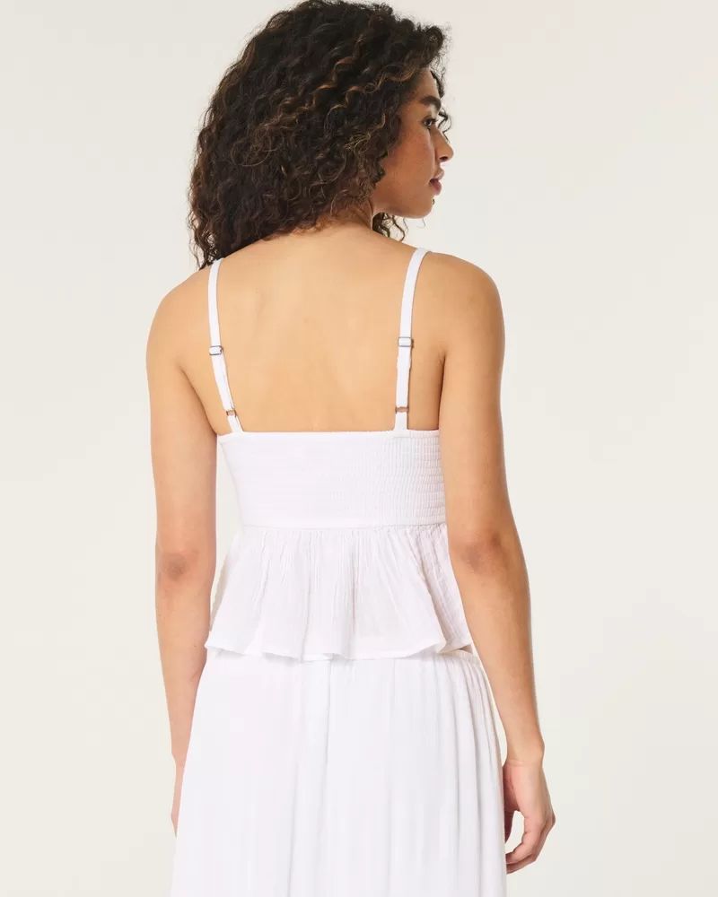 Super soft and unbelievably cute, this top features crochet-style texture through the bust and a pretty gauze hem. Adjustable straps, v-neckline. Easy Fit. Imported.