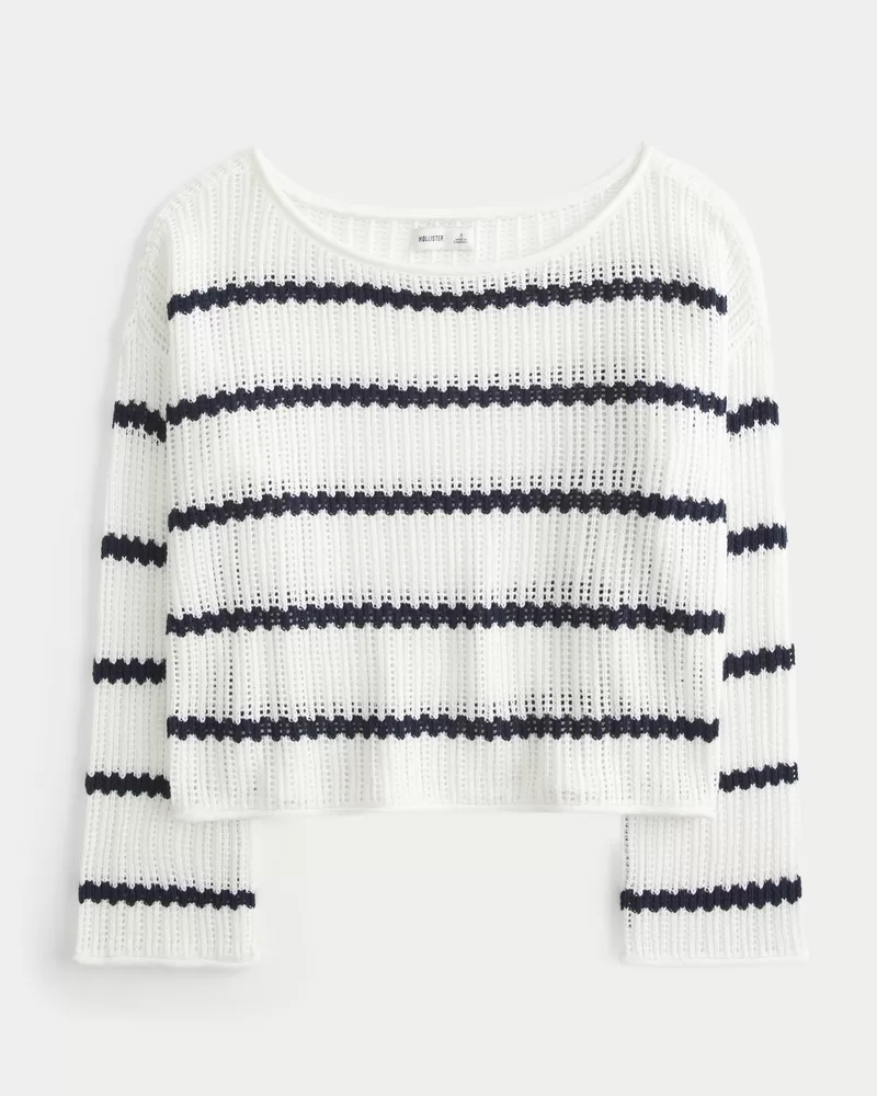 A super soft sweater in crochet-style fabric, featuring stitchy texture and a striped pattern. Relaxed crew neckline, long sleeves. Easy Fit. Imported.