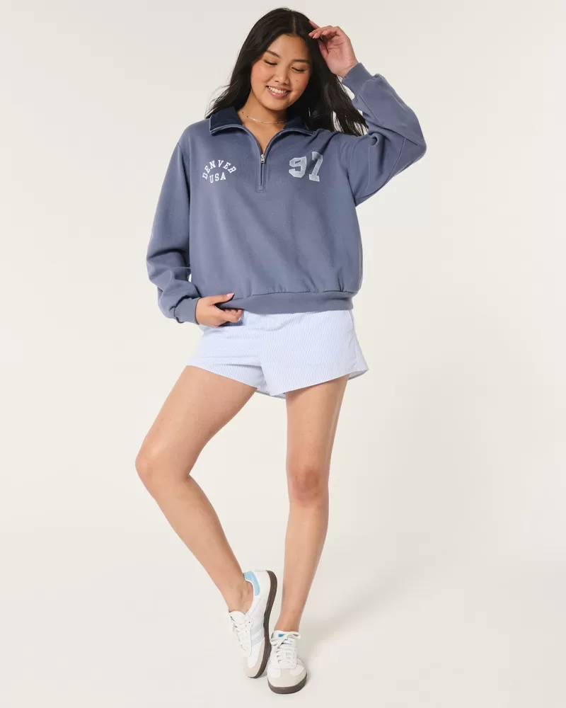 A super soft fleece sweatshirt Denver USA graphic embroidery at the right chest and athletic-inspired print graphics at the left chest. Mock-neck collar with half-zip placket, long sleeves. Easy Fit. Imported.