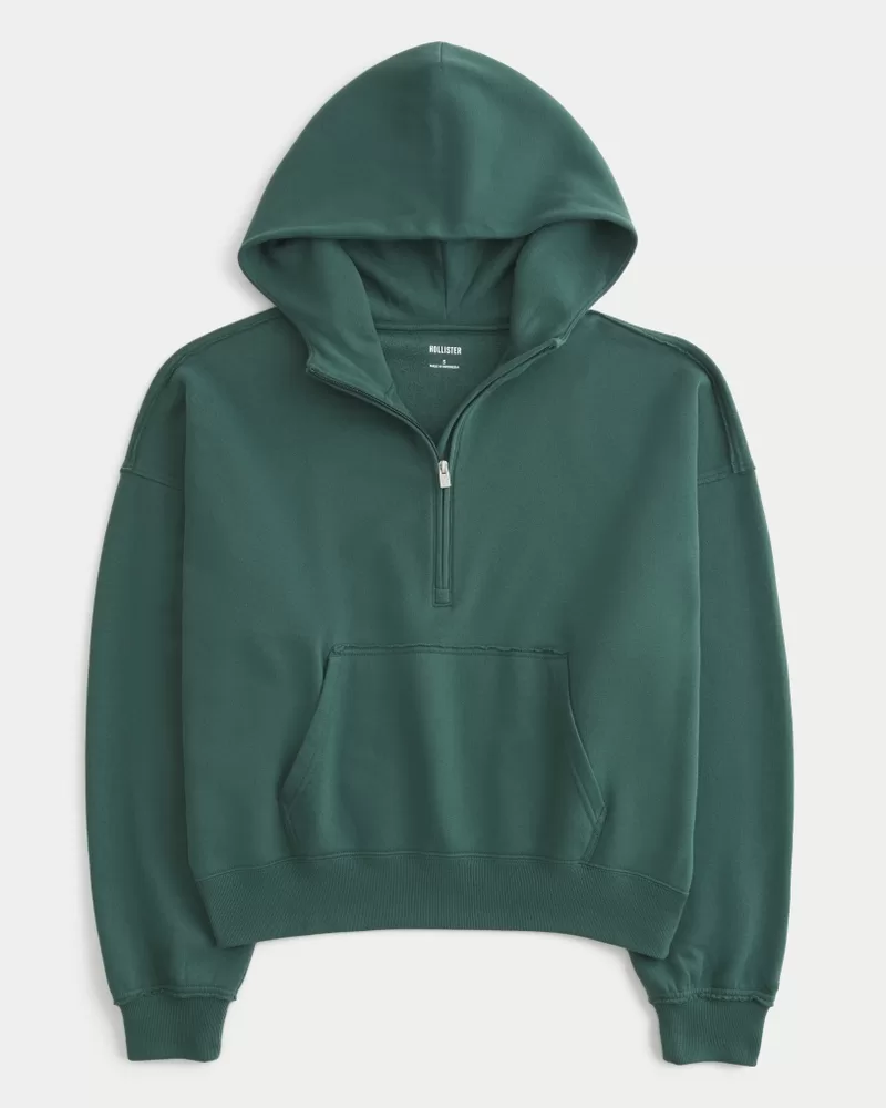 A super soft fleece hoodie with a half-zip closure and front pouch pocket. Long sleeves, hood. Easy Fit. Imported.