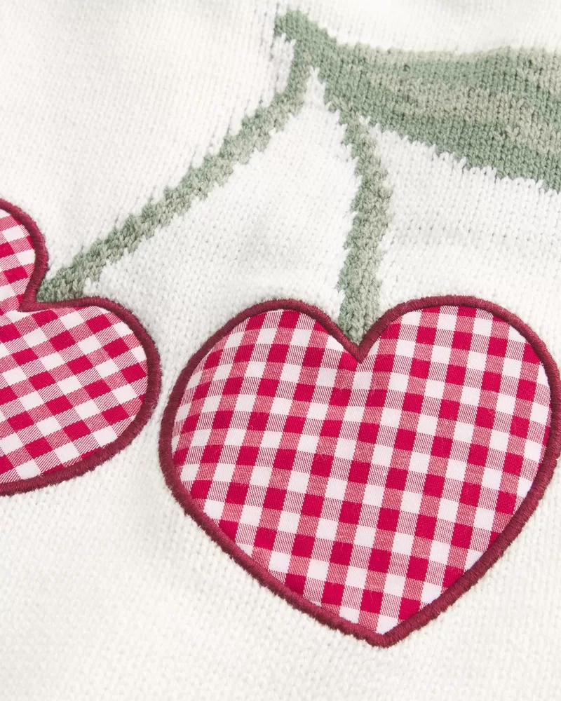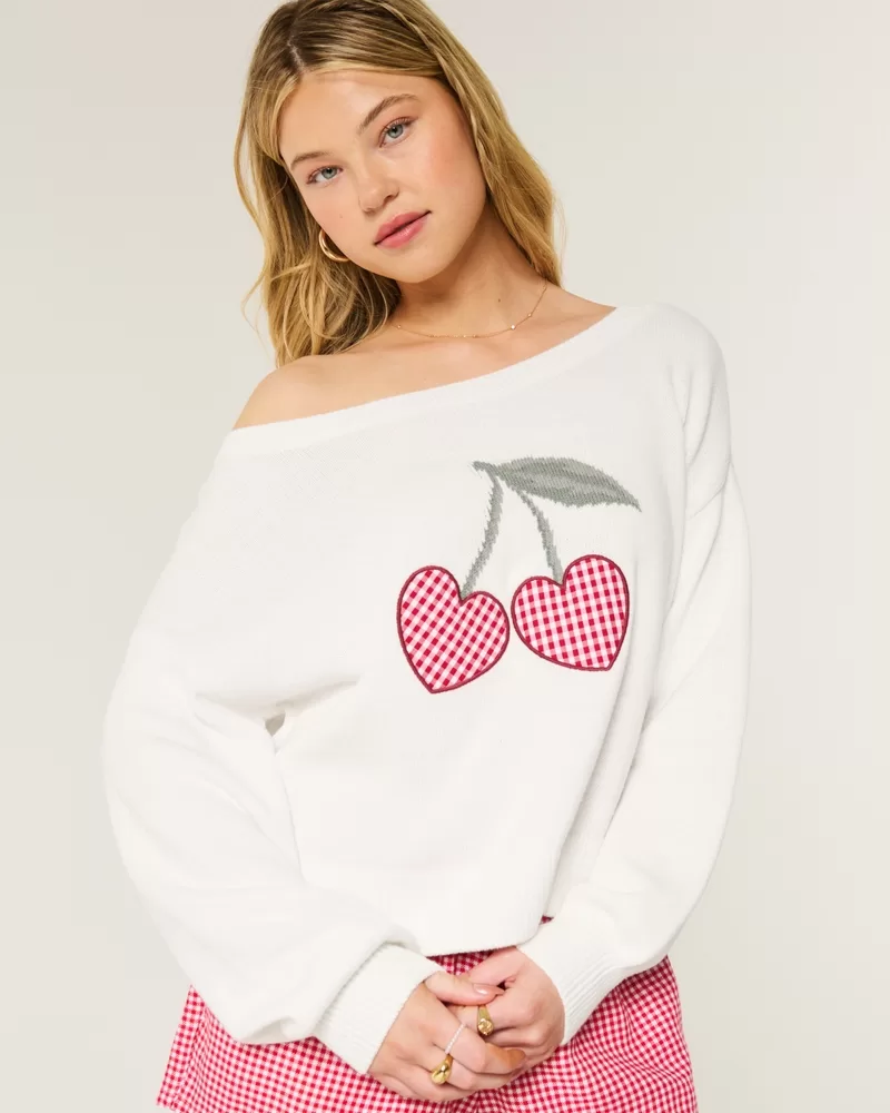 Cozy and super soft, this sweater features Valentine’s Day-inspired heart cherry intarsia graphics and applique. Relaxed neckline can be worn off one shoulder, ribbed trims, long sleeves. Easy Fit.