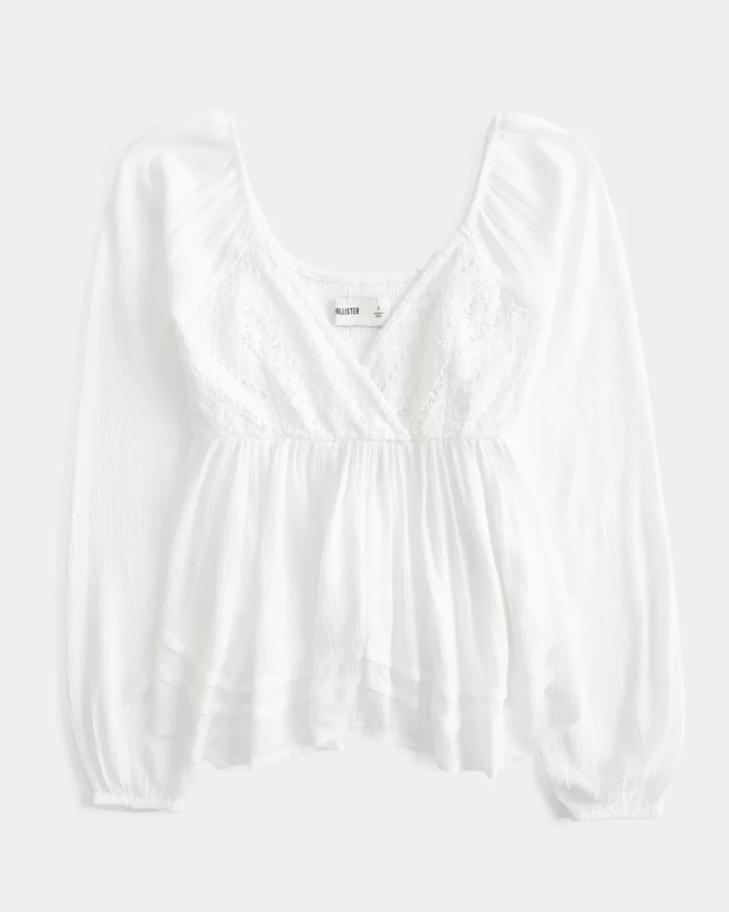 Pretty and super soft, this long-sleeve top is designed with a babydoll silhouette and lace bust. Handkerchief hem, smocked back. Easy Fit.