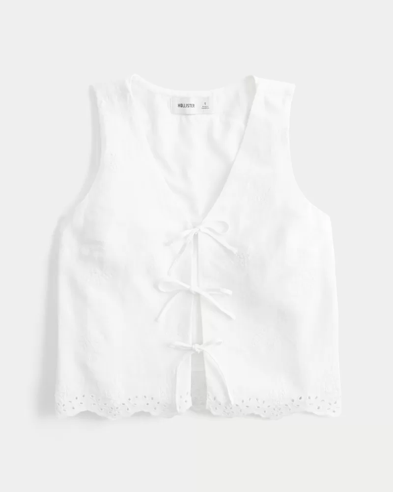 This cute vest is made with a soft linen blend and features a front tie closure and all-over embroidered floral details. Easy Fit.