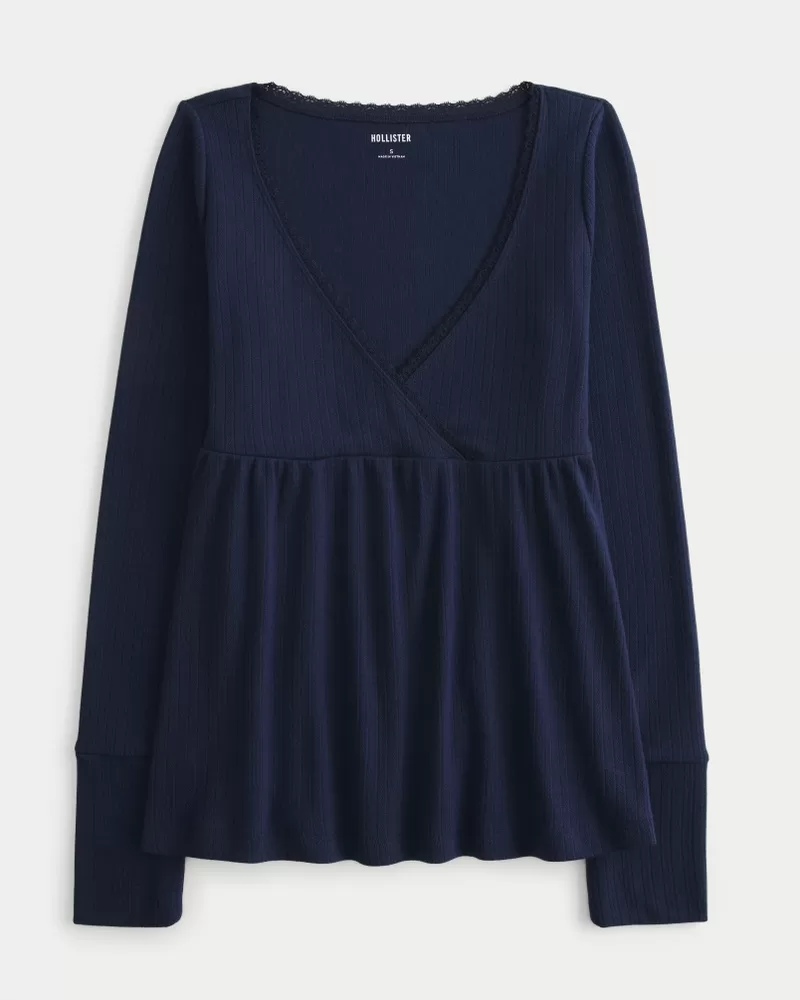 Flowy and super soft, this longs-sleeve top is made with textured pointelle fabric. Wrap-style v-neckline with pretty lace trim, flowy hem. Easy Fit. Imported.