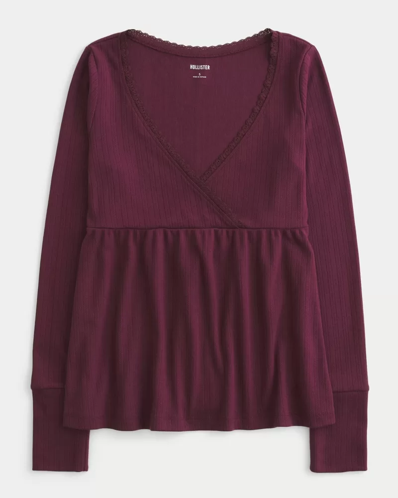 Flowy and super soft, this longs-sleeve top is made with textured pointelle fabric. Wrap-style v-neckline with pretty lace trim, flowy hem. Easy Fit. Imported.