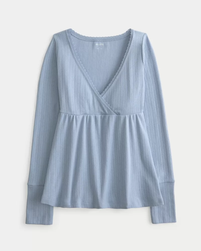 Flowy and super soft, this longs-sleeve top is made with textured pointelle fabric. Wrap-style v-neckline with pretty lace trim, flowy hem. Easy Fit.