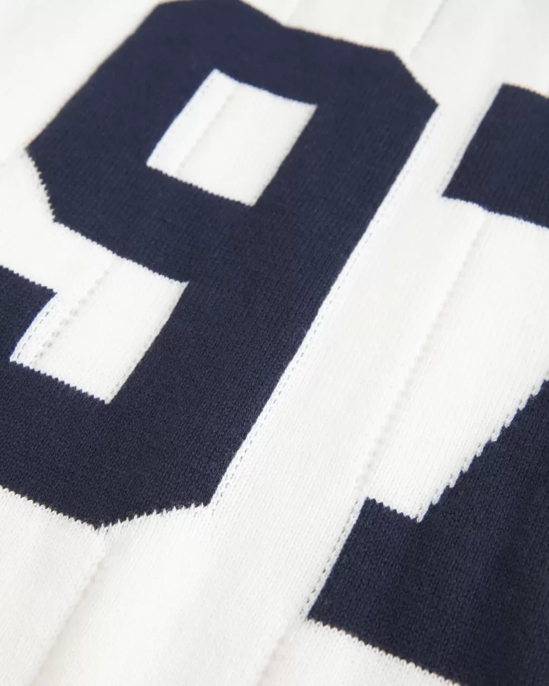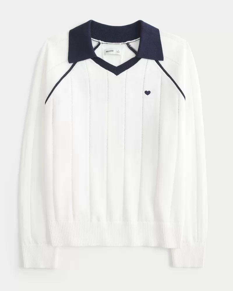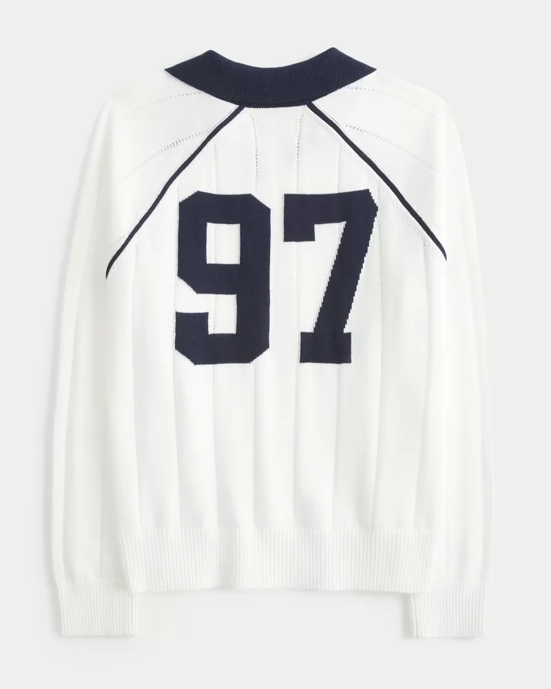 A super soft sweater polo featuring a collar, long sleeves, and heart embroidery at the left chest. Intarsia number graphic at the back. Easy Fit. Imported.
