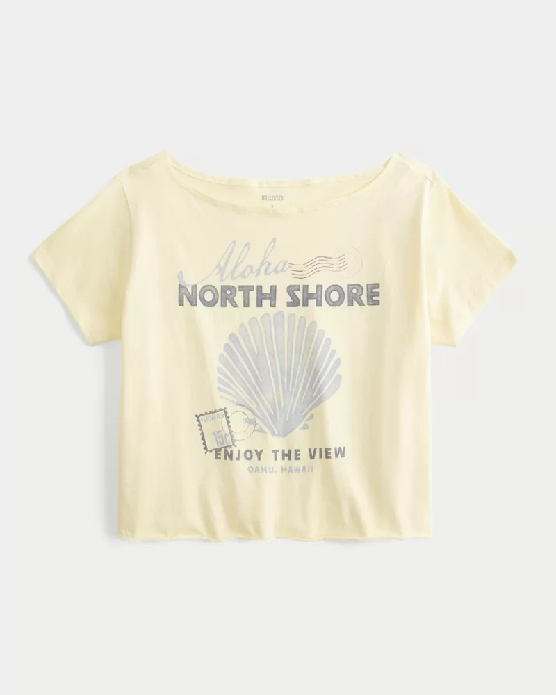 A super soft tee featuring an off-the-shoulder neckline and Aloha North Shore print graphics. Short sleeves. Easy Fit.