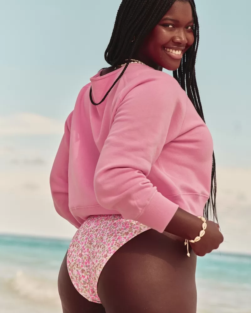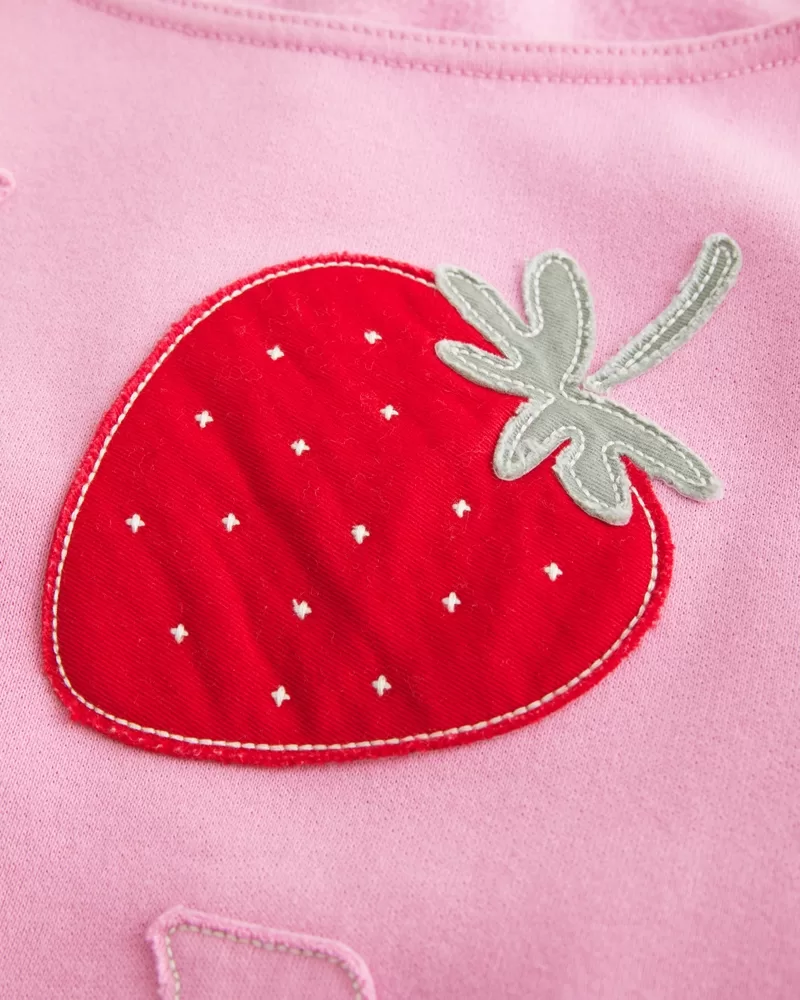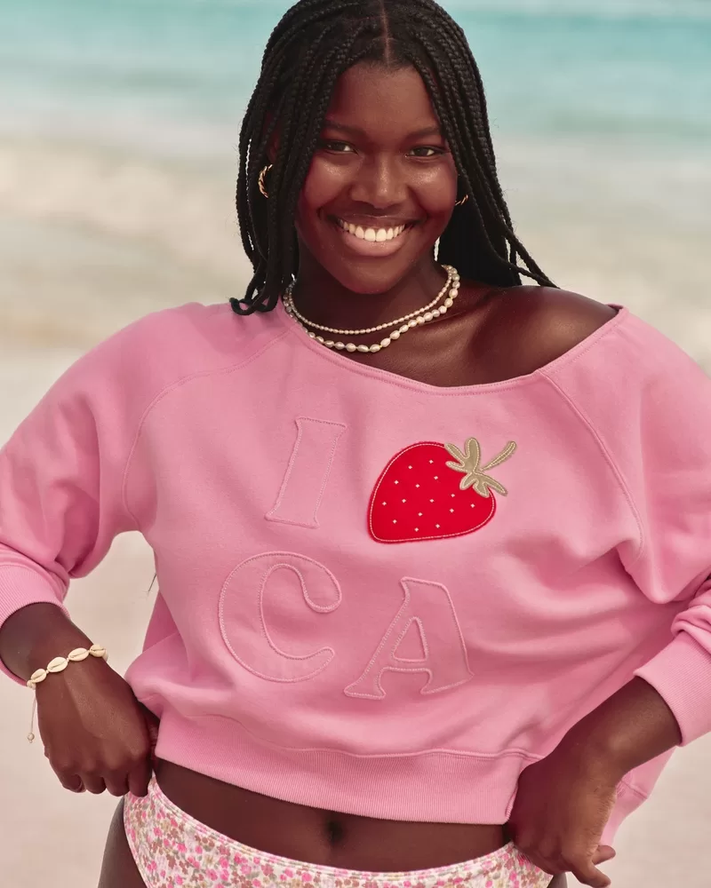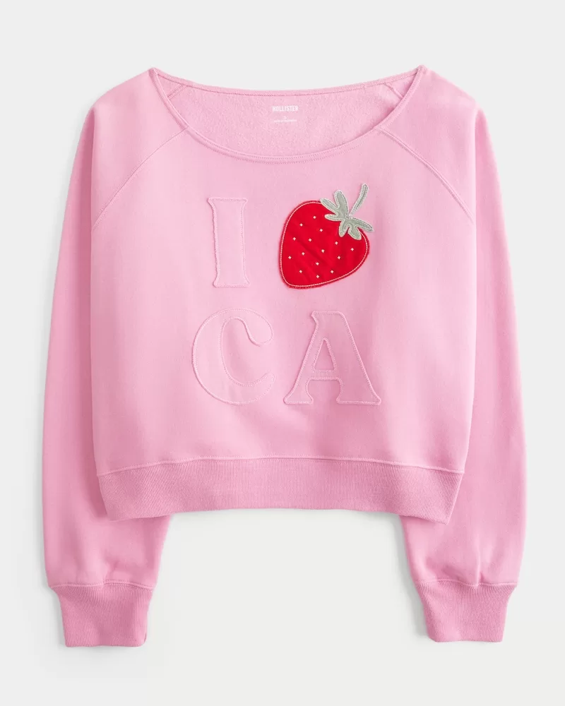 A super soft fleece sweatshirt featuring I Heart CA graphic applique with a cute berry detail. Off-the-shoulder neckline, long sleeves. Easy Fit.