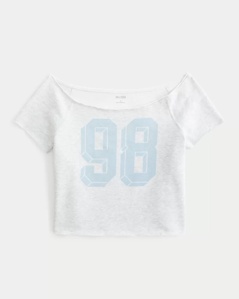 This super soft fleece sweatshirt is designed with short sleeves and an off-the-shoulder neckline. Sporty number print graphic. Easy Fit.