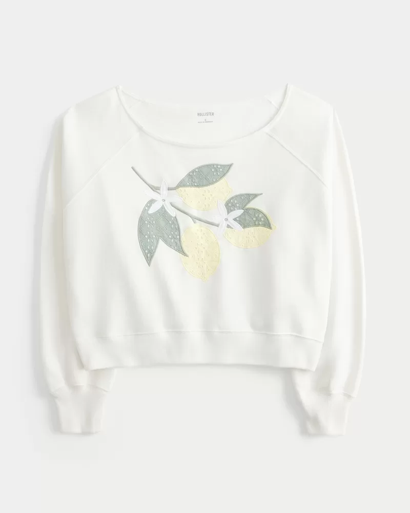 A super soft fleece sweatshirt featuring lemon graphic applique and an off-the-shoulder neckline. Long sleeves. Easy Fit.