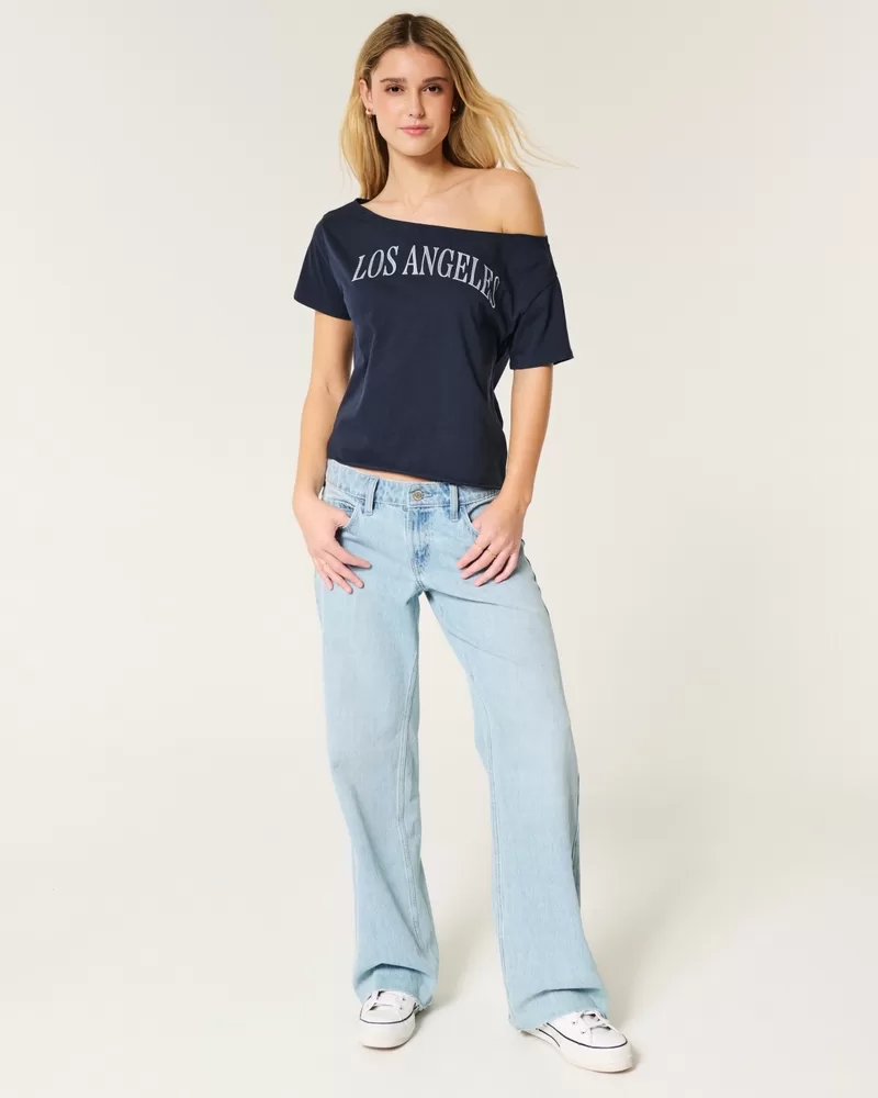 This super soft tee features Los Angeles print graphics and an off-the-shoulder neckline. Short sleeves, slouchy silhouette. Easy Fit.