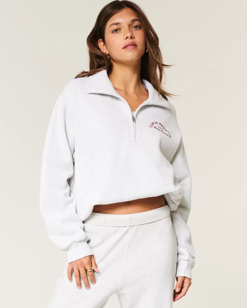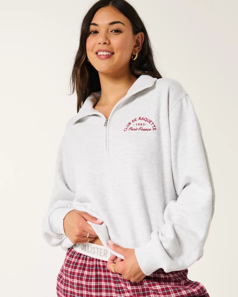 Super soft and comfy, this fleece sweatshirt features Paris France Club de Raquette graphic embroidery at the left chest and back. Mock-neck collar with a half-zip closure, long sleeves. Easy Fit. Imported.