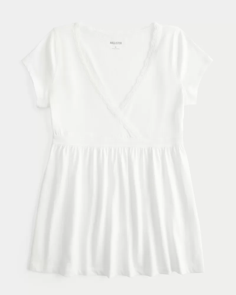 A cute and super soft babydoll top featuring a wrap-style v-neckline with lace trim. Short sleeves, flowy hem. Easy Fit. Imported.