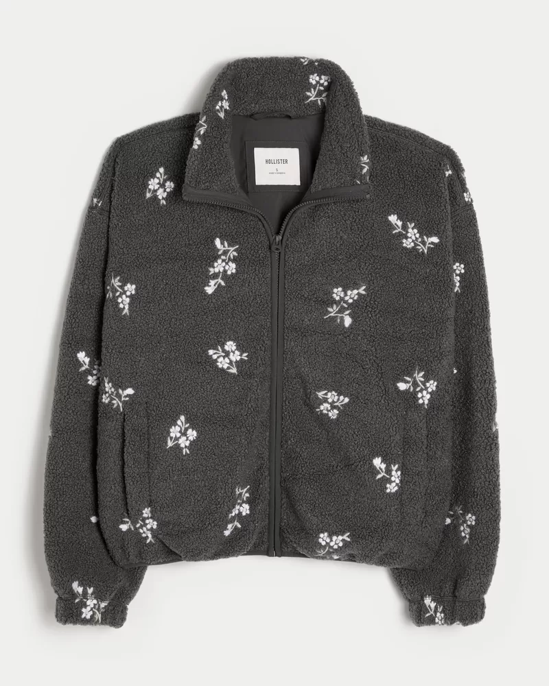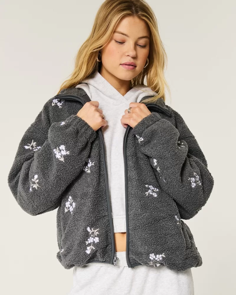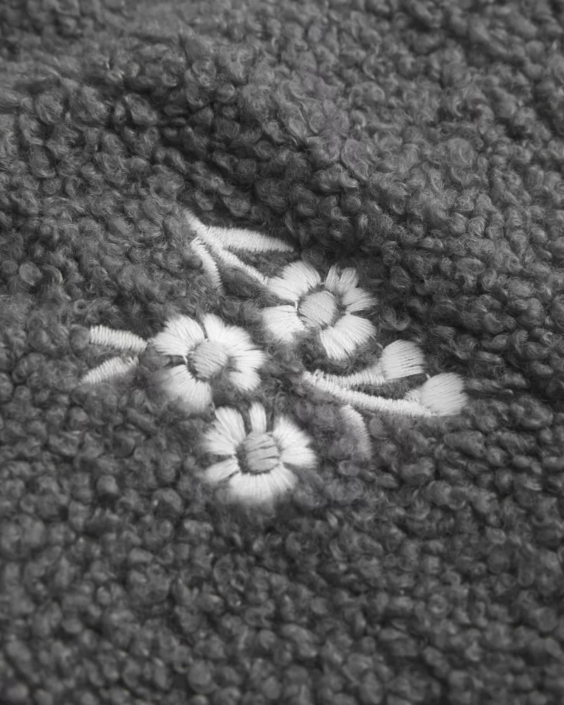 A super soft and cozy jacket in sherpa fleece fabric, featuring all-over embroidered floral details and a full zip-up closure. Mock-neck collar, pockets.