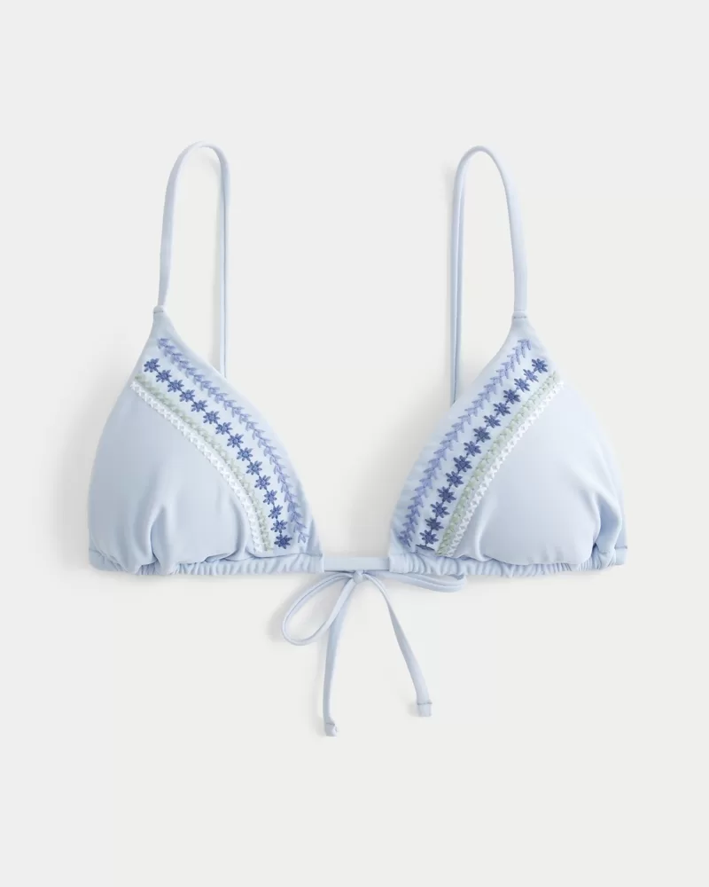 This cute and comfy bikini top is designed with a triangle silhouette and a tie-back closure. Removable padding, embroidered stitching details.